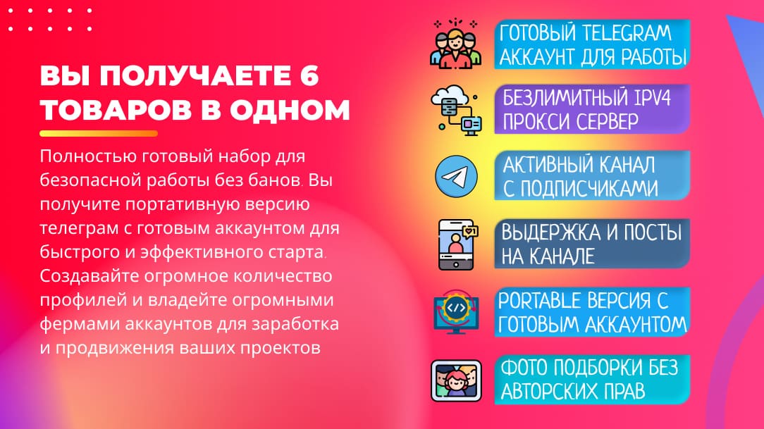 Вы получаете 10 товаров в одном продукте: Профессиональный Telegram аккаунт с ручной регистрацией и фармом под тематику ГЕМБЛИНГ + Создан тематический телеграм канал с активными подписчиками + 10 тематических фото на аккаунте + 10 тематических фото на канале + 10 постов на канале + Выделенный безлимитный IpV4 прокси сервер + Все системы защиты аккаунта + Удобная Portable версия для быстрого запуска + User Agent + Антибан. Это профессиональное и самое выгодное предложение на рынке: вам не нужно тратить время на покупку каждого пункта отдельно — вы сразу получаете полностью готовый аккаунт для работы с рекламой, продвижением и маркетингом. Все аккаунты адаптированы под VPN, безопасны для любых устройств и эмуляторов.