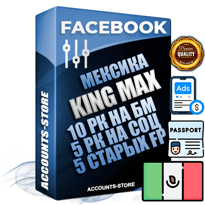 Самые мощные Мексиканские KING MAX аккаунты Facebook в мире, Вы получаете 13 товаров в одном: Трастовый KING MAX аккаунт с живыми друзьями + Заполненную родную Fan Page + 10 рекламных кабинетов на бизнес менеджере + 5 рекламных кабинетов на соц. профиле + 5 старых Fan Page + Выделенный Безлимитный IpV4 прокси сервер + Подтвержденную рабочую почту + Cookie Json + Документы + 2FA + Токен EAAB + User Agent + Полный архив с дополнительным набором данных. Это профессиональное и самое выгодное предложение на рынке. Вам не нужно тратить время по покупку всего этого по отдельности, сразу приступайте к работе с рекламой.